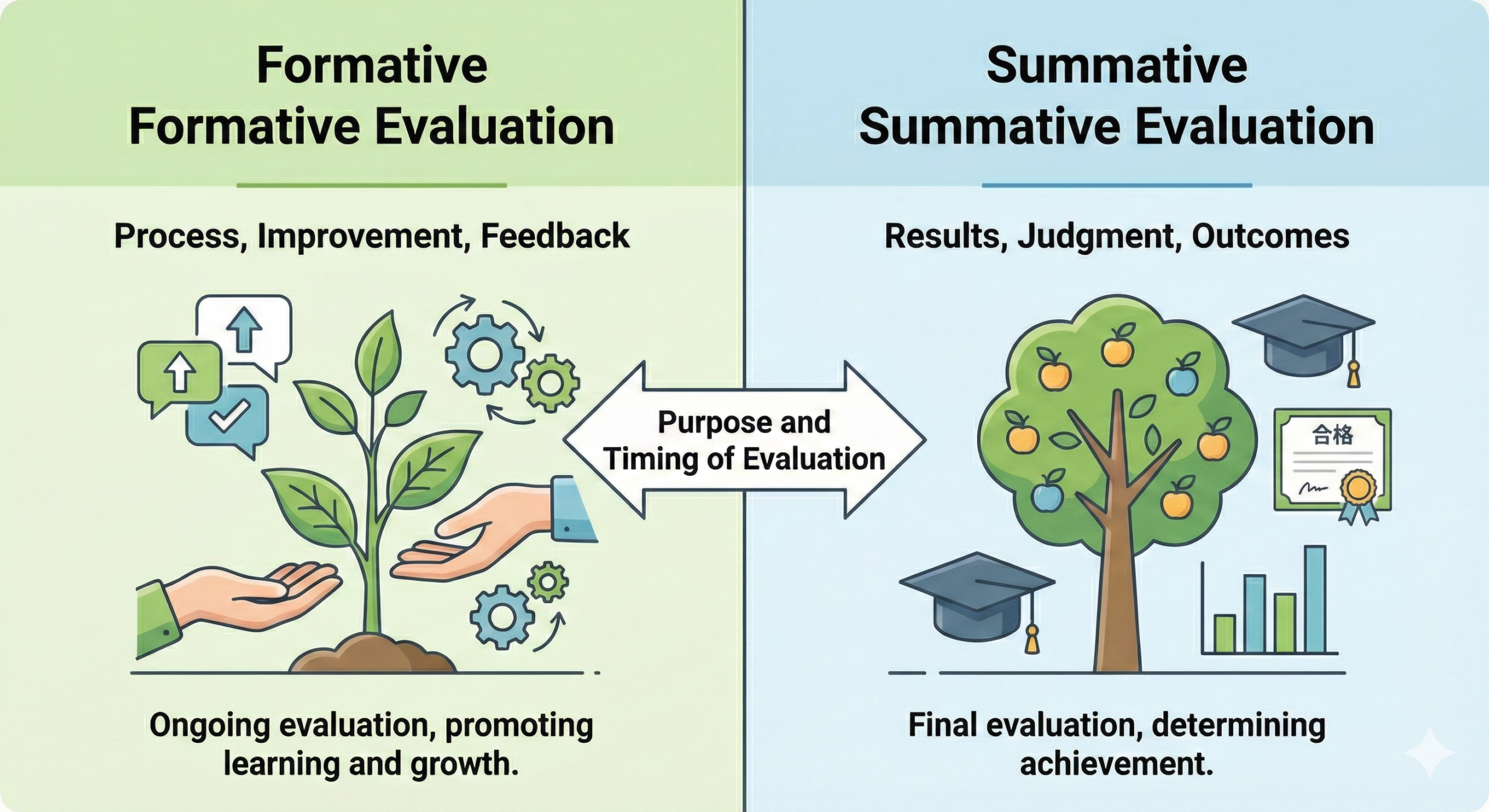 To understand this concept, consider the example of periodic tests in schools. The traditional evaluation method of checking learning comprehension only through final exams often results in a situation where, by the time insufficient understanding is discovered, the class has already moved on to the next unit, making effective improvement difficult. In contrast, formative evaluation—which involves administering daily quizzes to check comprehension—enables real-time understanding of students’ comprehension levels, allowing for immediate supplementary lessons or adjustments to teaching methods as needed.