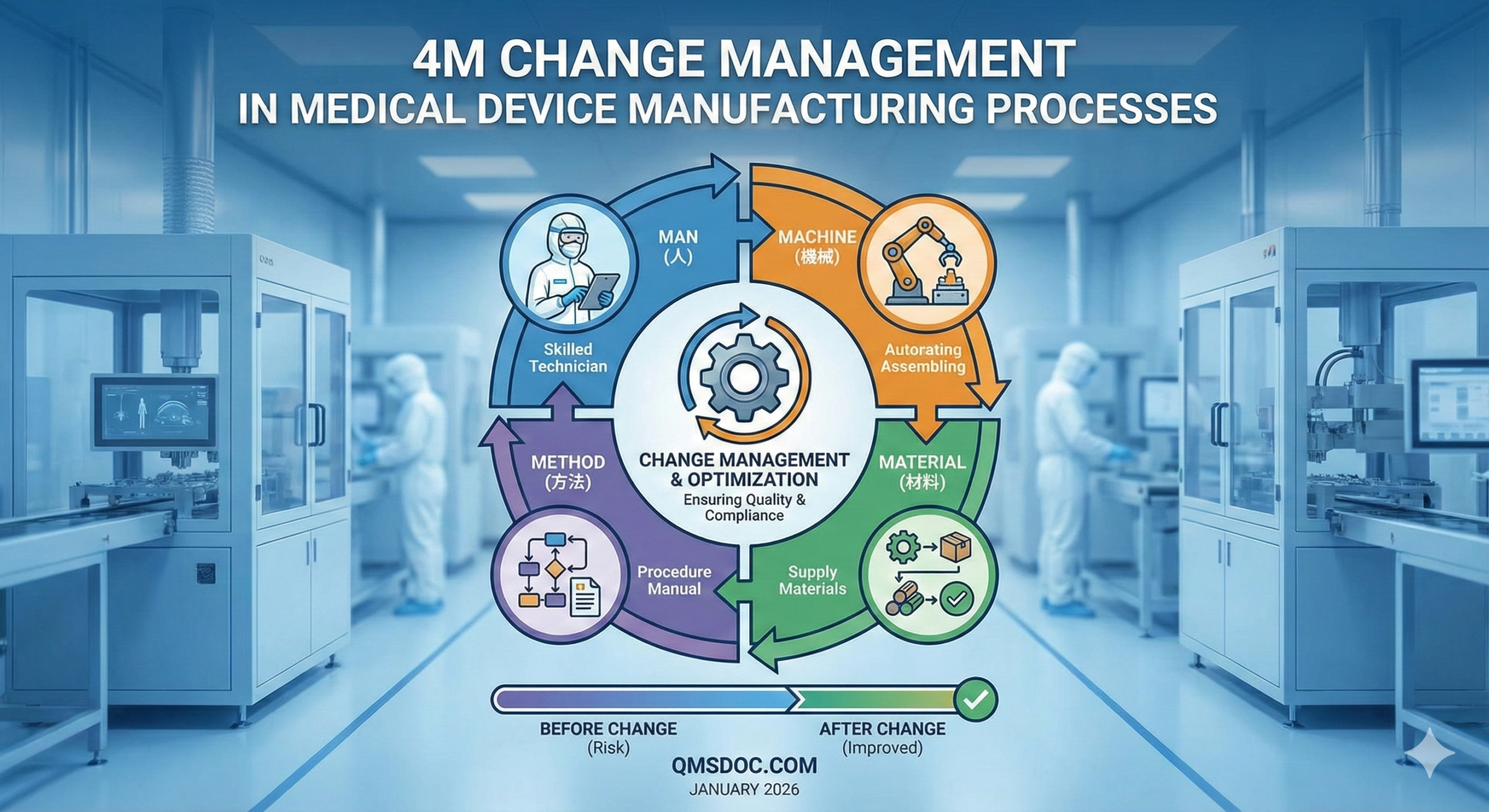 4M change management in medical device manufacturing is based on a strict process system founded on FDA QMSR (effective February 2026) and ISO 13485:2016. When changes occur in any of Machine, Material, Method, or Measurement, appropriate evaluation of their impact and implementation of necessary measures are required.