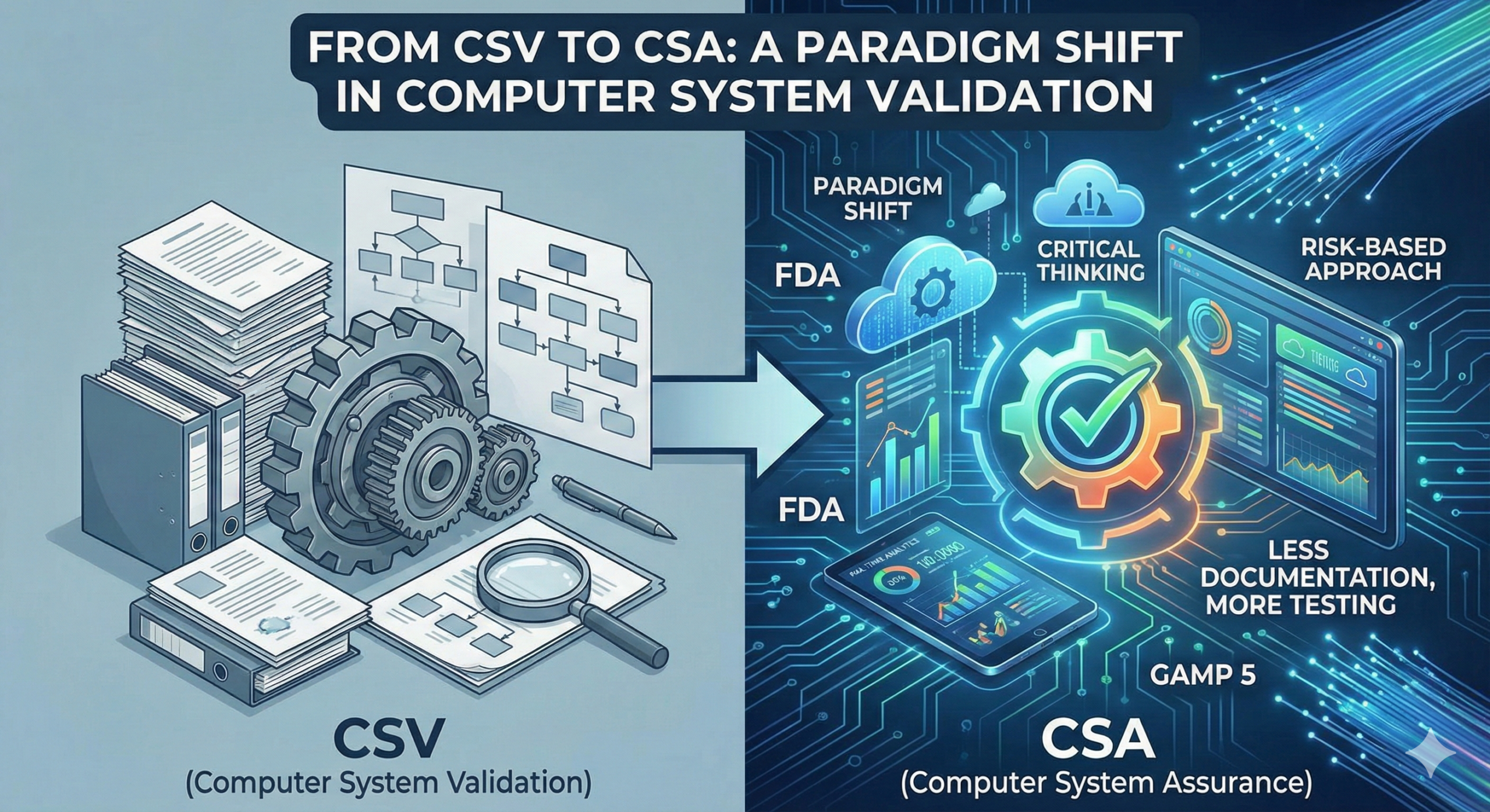 The paradigm shift from Computer System Validation (CSV) to Computer Software Assurance (CSA) represents a fundamental modernization of regulatory expectations for software used in pharmaceutical and medical device manufacturing and quality systems. By emphasizing critical thinking, risk-based approaches, and fitness for intended use, CSA enables organizations to reduce unnecessary validation burden while maintaining – and potentially enhancing – assurance of patient safety, product quality, and data integrity.