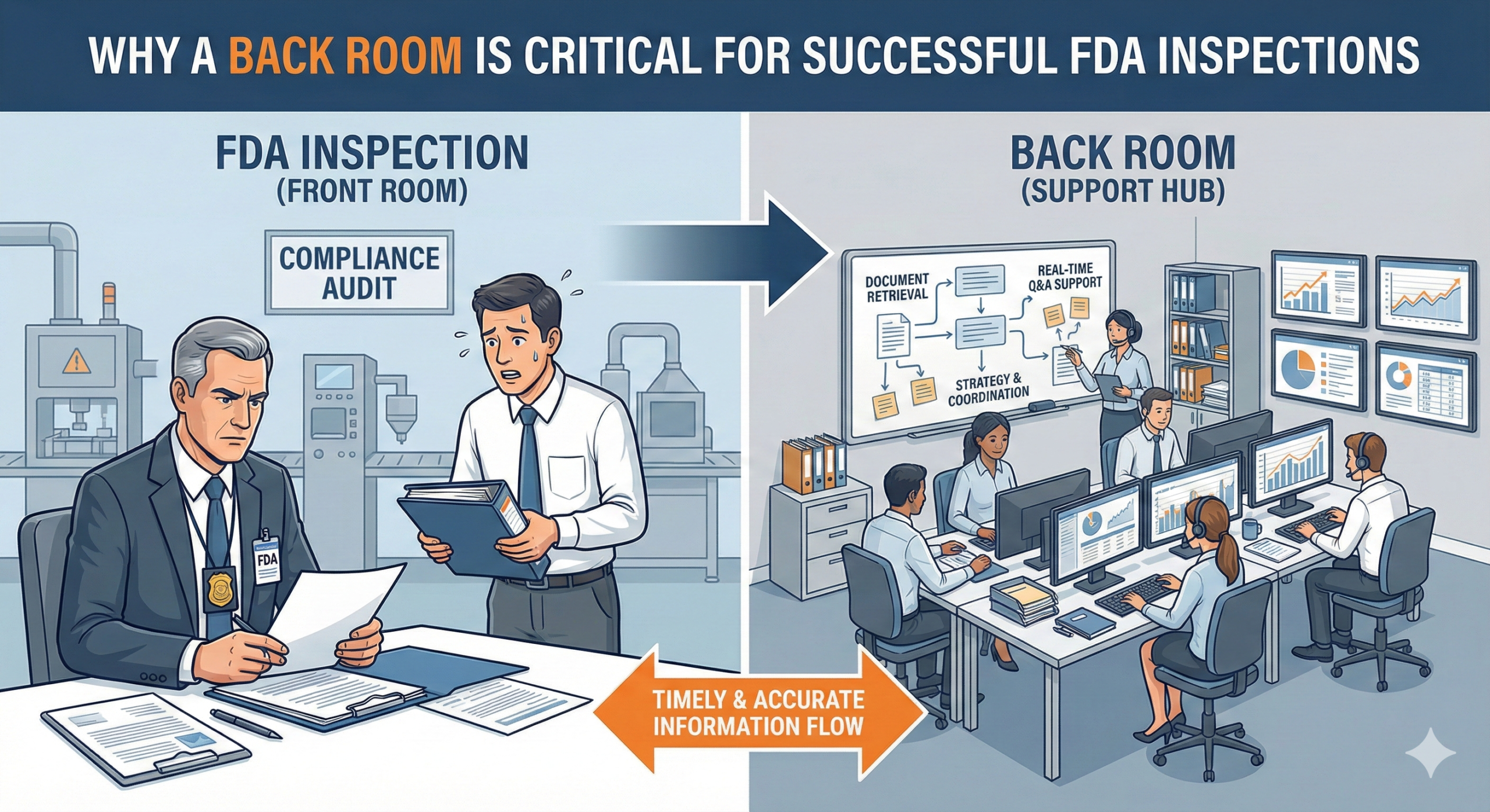 When responding to FDA inspections, organizations typically divide their operations into two distinct areas: the Front Yard (FY), where inspectors conduct document reviews and interviews, and the Backyard or Back Room (BY), where the inspection support team searches for documents, prepares responses, and coordinates subject matter experts (SMEs). This separation of functions has become a fundamental best practice in modern FDA inspection management. But why is this BY structure essential?